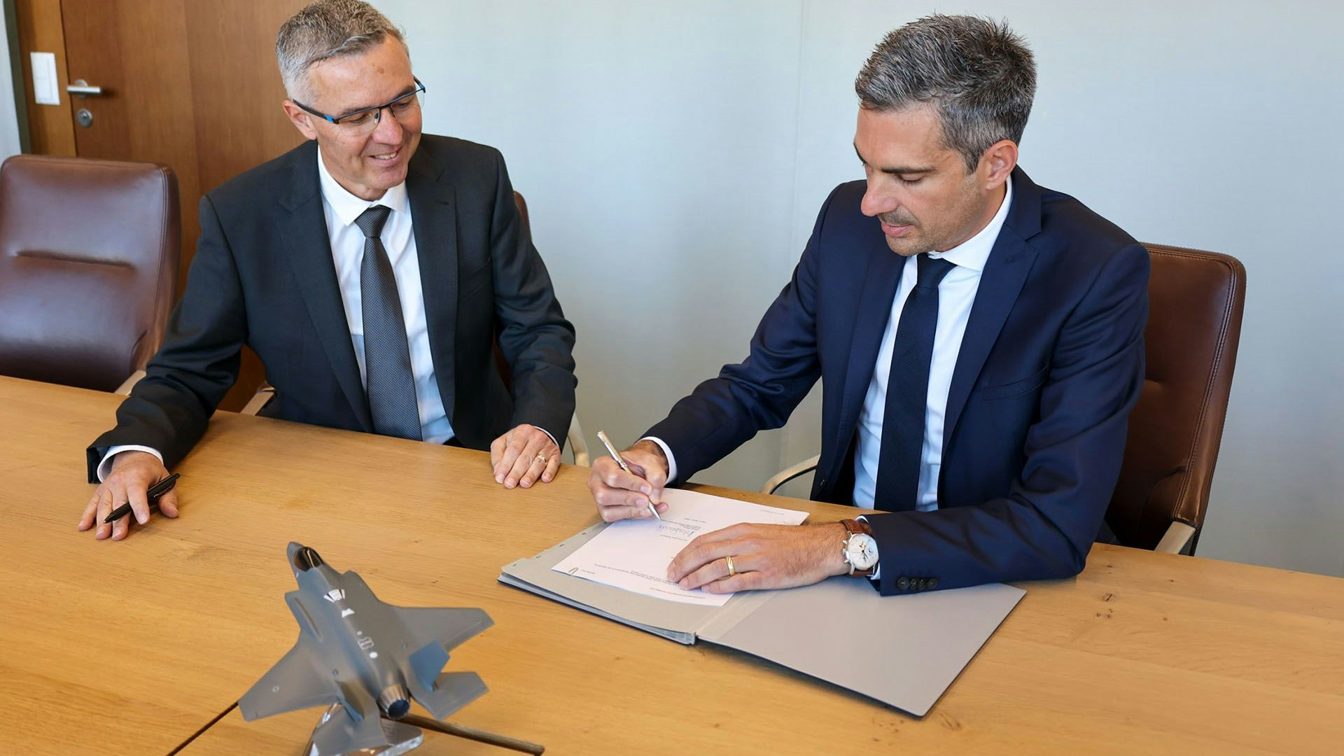 Rüstungschef Martin Sonderegger und Projektleiter Darko Savic haben am 19. September 2022 bei armasuisse in Bern den Beschaffungsvertrag mit der US-Regierung unterzeichnet. Damit ist die Beschaffung von 36 Kampfflugzeugen des Typs F-35A auch vertraglich beschlossen, nachdem das Parlament am 15. September den Verpflichtungskredit genehmigt hat. Die Flugzeuge werden ab 2027 bis 2030 ausgeliefert und werden die heutige Flotte der F/A-18 Hornet und F-5 Tiger ersetzen.