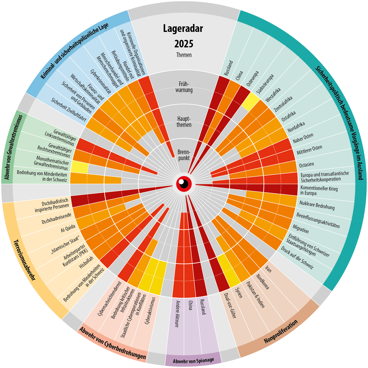 «Die Schweiz muss die Sicherheitslage im weltweiten Kontext sehen», erklärt NDB-Direktor Christian Dussey. «Die globale Konfrontation betrifft uns direkt. Unser Lageradar zeigt 15 Brennpunkte gleichzeitig – eine solche Bedrohungsdichte haben wir noch nie erlebt. Wir sind nicht Beobachter – wir sind Betroffene. Dazu kommt das Ringen um die technologische Vorherrschaft. Technologie ist heute ein entscheidender Schlüssel zur Macht. Auch davon ist die Schweiz als Innovationsstandort direkt betroffen, etwa durch Spionage und andere nachrichtendienstliche Aktivitäten. Der NDB und andere Sicherheitsbehörden in der Schweiz sind durch diese Herausforderungen stark gefordert. Herausforderungen, welchen nur gemeinsam mit unseren nationalen und internationalen Partnern im Verbund begegnet werden kann.»