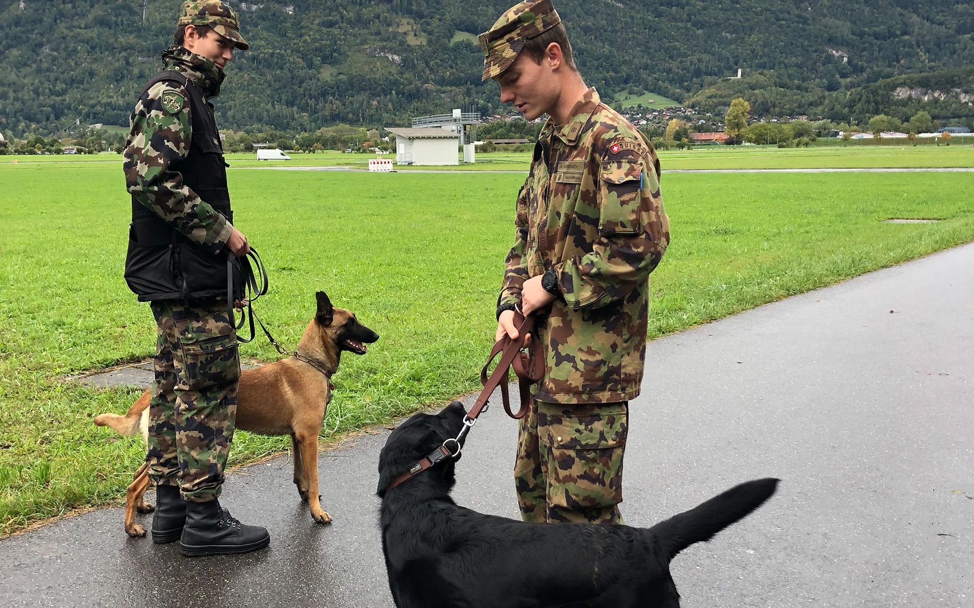 «Die meisten Rekruten verlassen die Rekrutenschule mit einem Gewehr, bei uns verlassen sie sie mit dem besten Freund.» Der 26-jährige Waadtländer Leutnant und Zugführer Luca Lezzi fasst die Besonderheit der Hundeführer-RS prägnant zusammen. Unter Lezzis Aufsicht bereiten sich die Rekruten an diesem Vormittag im strömenden Regen auf dem Flugplatz in Wilderswil auf die Prüfung zum Erhalt des Nationalen Hundehalterbrevets vor.