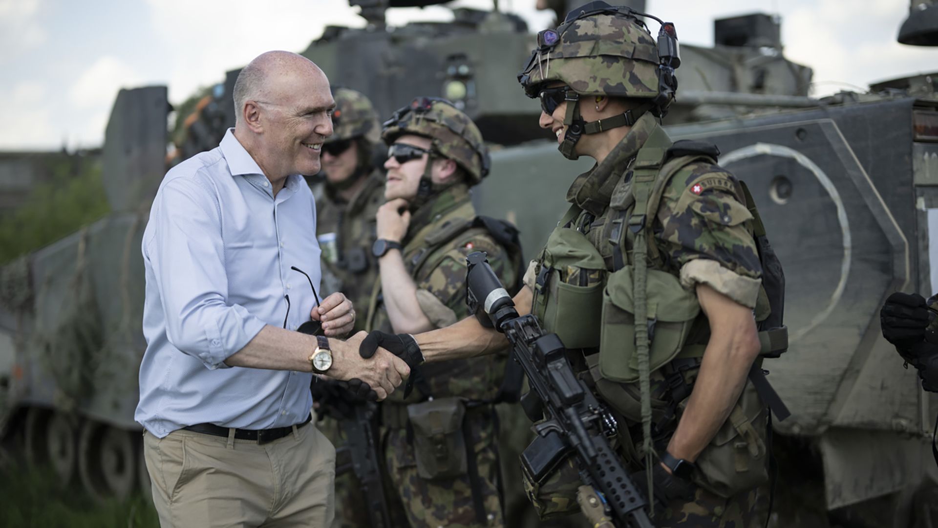 Le conseiller fédéral Pfister rend visite à la troupe lors de l'exercice TRIAS