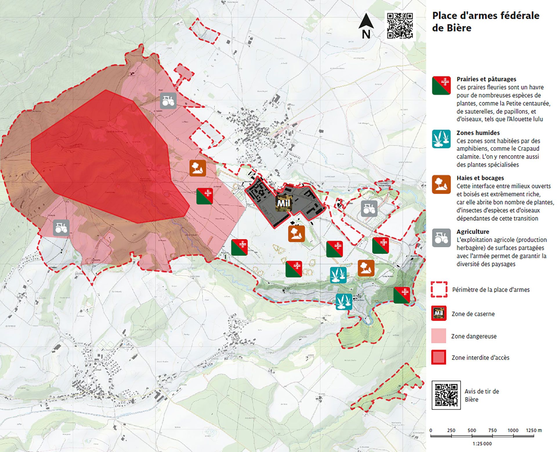En 1835 déjà, une caserne a été construite suite à une première convention avec la commune. La place d'armes est utilisée toute l’année comme centre d'instruction de l'artillerie et de l'infanterie mécanisée. Sise entre le lac Léman et le Pied sud du Jura, la place d’armes de Bière fait partie du Parc Jura vaudois. Elle se situe au sein de prairies de fauche, bordée par des forêts de pentes dominées par des feuillus et plongeant vers deux cours d’eau, l’Aubonne et le Toleure. L’ensemble de la place d’armes forme un patrimoine naturel unique d’importance nationale.