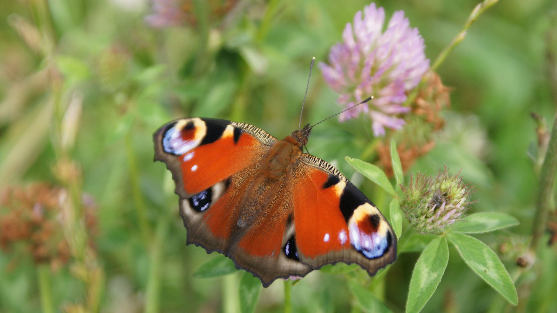 Diese wurden im Umfeld der Fünffingerpisten neu geschaffen, werden zu vorgegebenen Schnittzeitpunkten gemäht und dürfen nicht gedüngt und gemulcht werden, um die Pflanzenvielfalt zu erhalten. Davon profitierenauch Schmetterlinge wie das Tagpfauenauge. - Wiesen, Weiden und Flachmoor