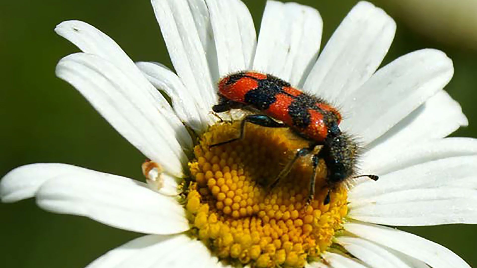 Artenreiche Mähwiesen und Weiden werden spät gemäht und nicht gedüngt, so dass die grosse Vielfalt von Pflanzen und Insekten erhalten bleibt – wie zum Beispiel das Schachbrett oder die Wucherblume mit dem Zottigen Bienenkäfer. - Hecken und Waldränder