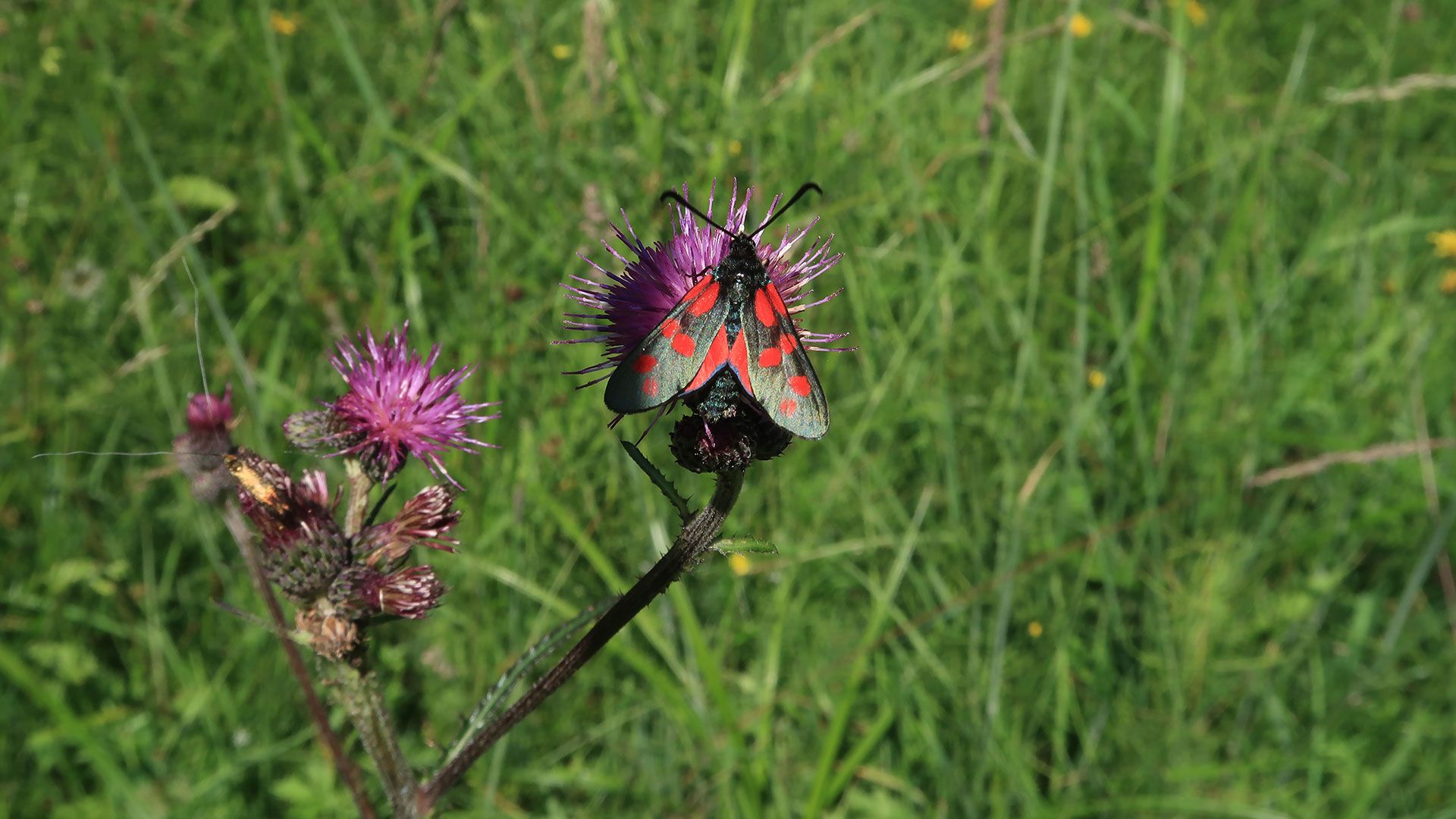 Mit angepassten Schnitt-, Dünge- und Weideregimen werden die Naturwerte erhalten. Damit gedeihen Blumen und Insekten wie z. B. das Sechsfleck-Widderchen. - Feuchtgebiete und Moore