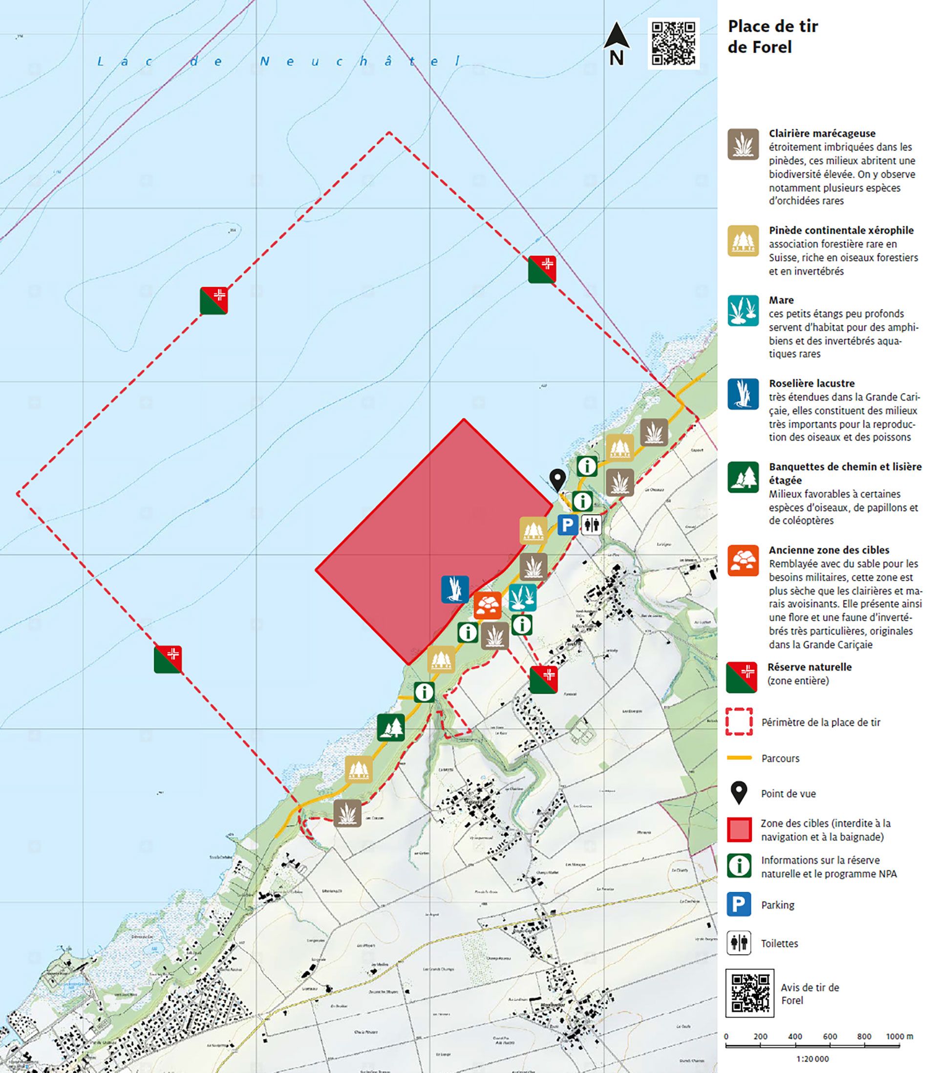 La place de tir de Forel, sise dans le secteur de la Vernause existe depuis 1932 et est utilisée par les Forces aériennes pour les activités de tirs par aéronefs et de Sea Survival. Située en plein coeur de la Grande Cariçaie, dans la réserve naturelle des Grèves de la Corbière, la place de tir de Forel présente une biodiversité exceptionnelle. En comparaison avec d’autres réserves de la Grande Cariçaie, celle-ci est plutôt dominée par des forêts, dont une association forestière rare en Suisse, la pinède à Pin sylvestre et le Genévrier. Ces forêts plutôt claires, entrecoupées de clairières marécageuses, hébergent une faune et une flore riches.