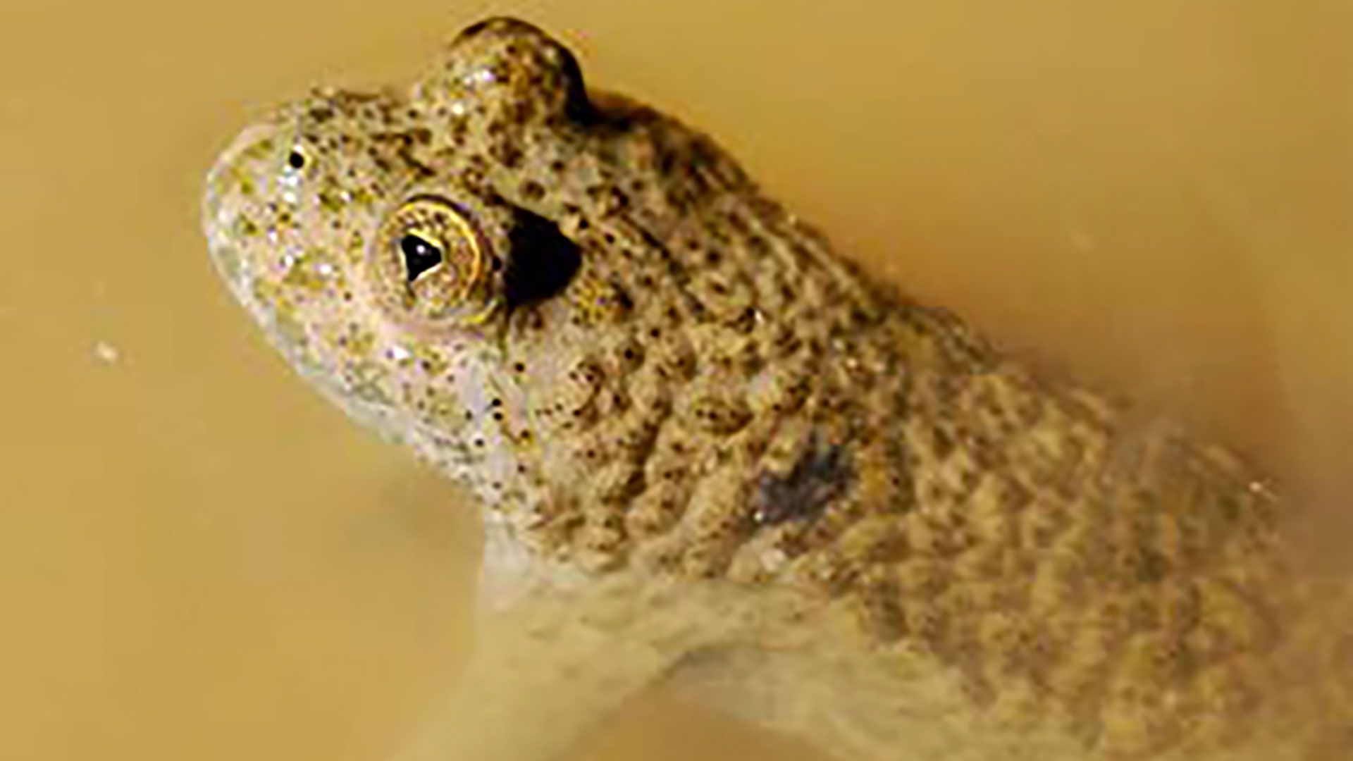 Die Gelbbauchunke ist die seltenste der sechs Amphibienarten (Grasfrosch, Erdkröte, Bergmolch, Fadenmolch, Wasserfrosch, Gelbbauchunke), welche auf diesem Schiessplatz leben. Sie braucht jährlich erneuerte Kleingewässer, viel Sonne aber auch Schattenplätze, die arm an Frassfeinden für ihre Larven sind — © VBS-DDPS, René Güttinger