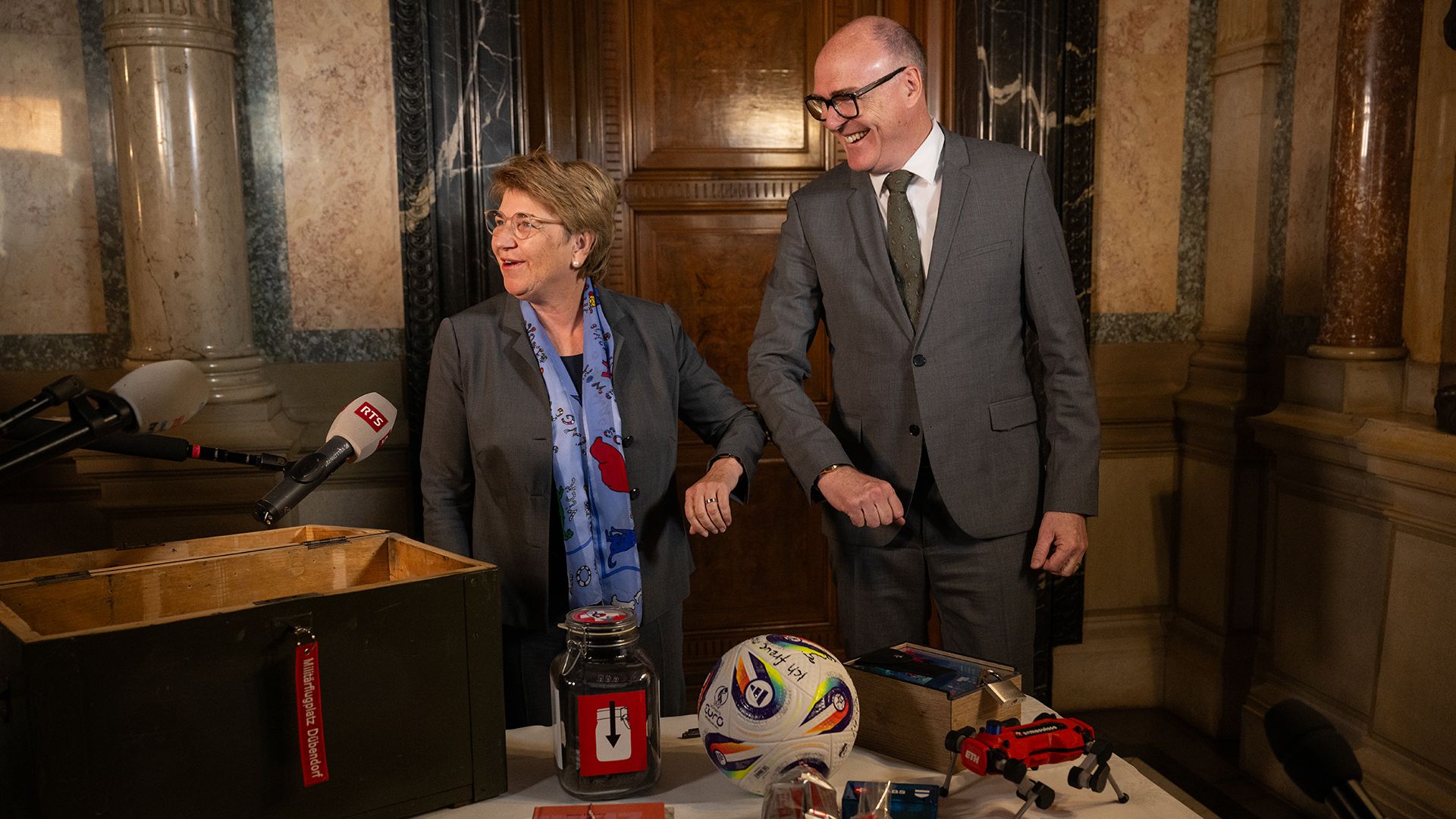 Le vendredi 28 mars 2025, au Palais fédéral Est, la conseillère fédérale Viola Amherd a remis symboliquement la clé de son bureau à son successeur, le conseiller fédéral Martin Pfister. Tous deux se sont ensuite adressés brièvement aux médias.