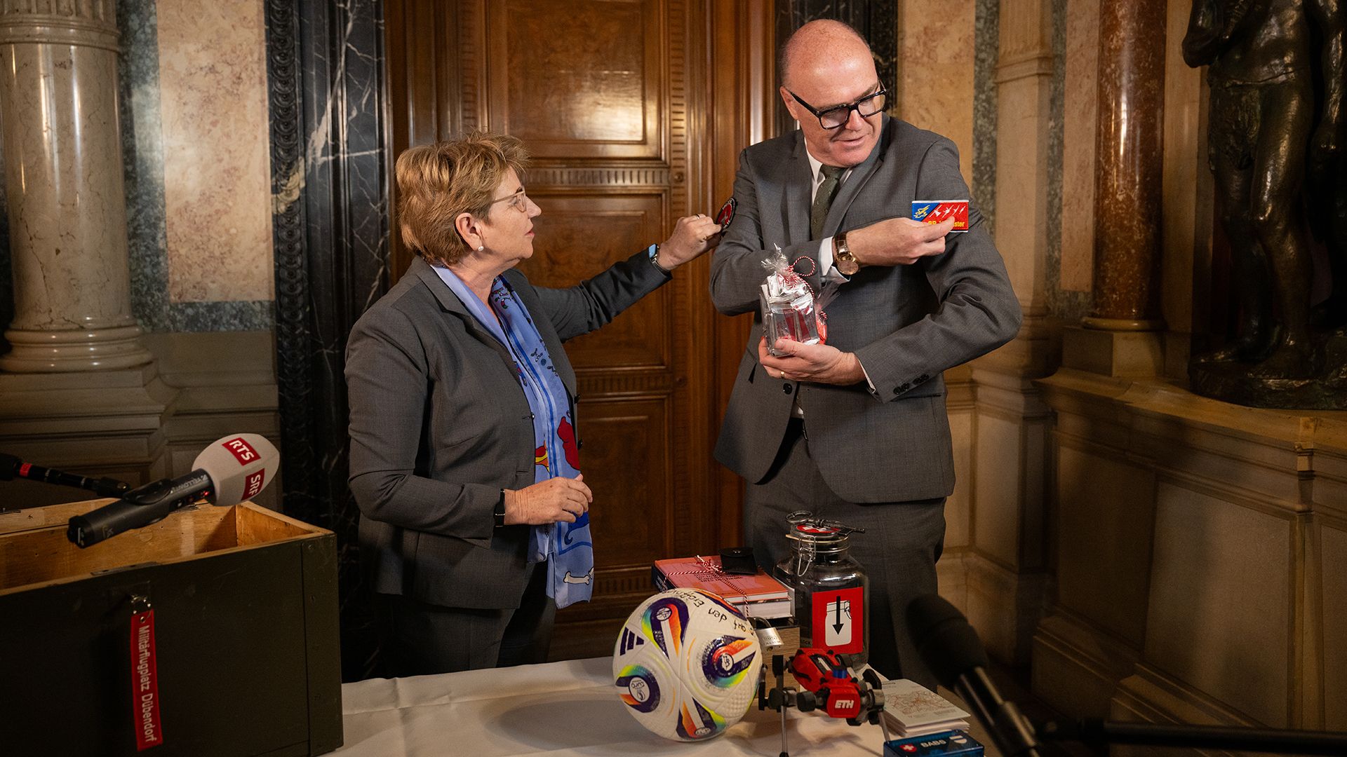 La conseillère fédérale Viola Amherd a offert au nouveau chef du DDPS un roman policier d’Anne Holt. Elle a également remis divers cadeaux représentant les unités administratives du département.