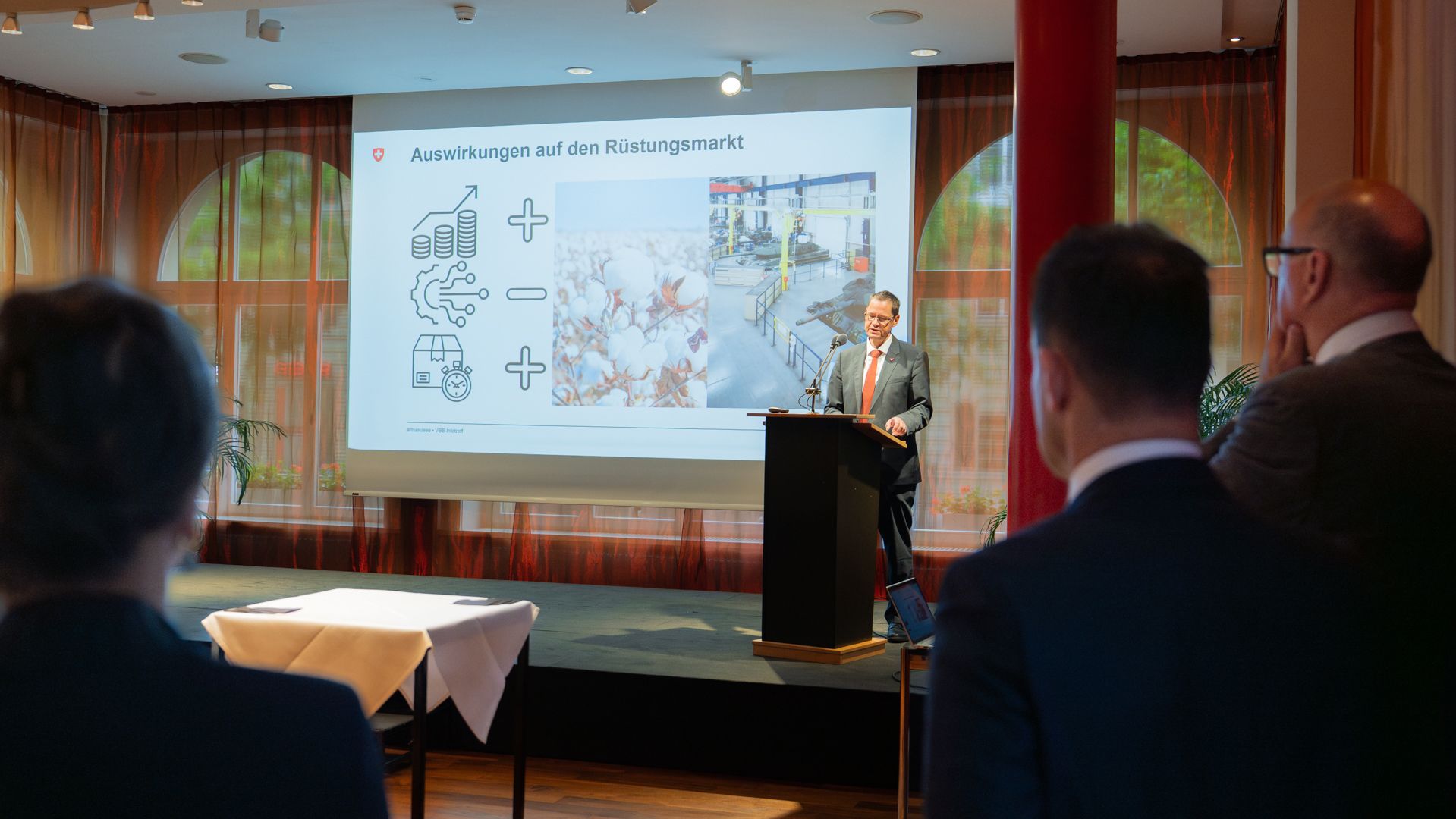 Le conseiller fédéral Martin Pfister a ensuite donné la parole au chef de l’armement, Urs Loher, qui a présenté en détail les défis considérables auxquels l’industrie de l’armement est confrontée aujourd’hui en Suisse et souligné l’urgence d’agir.