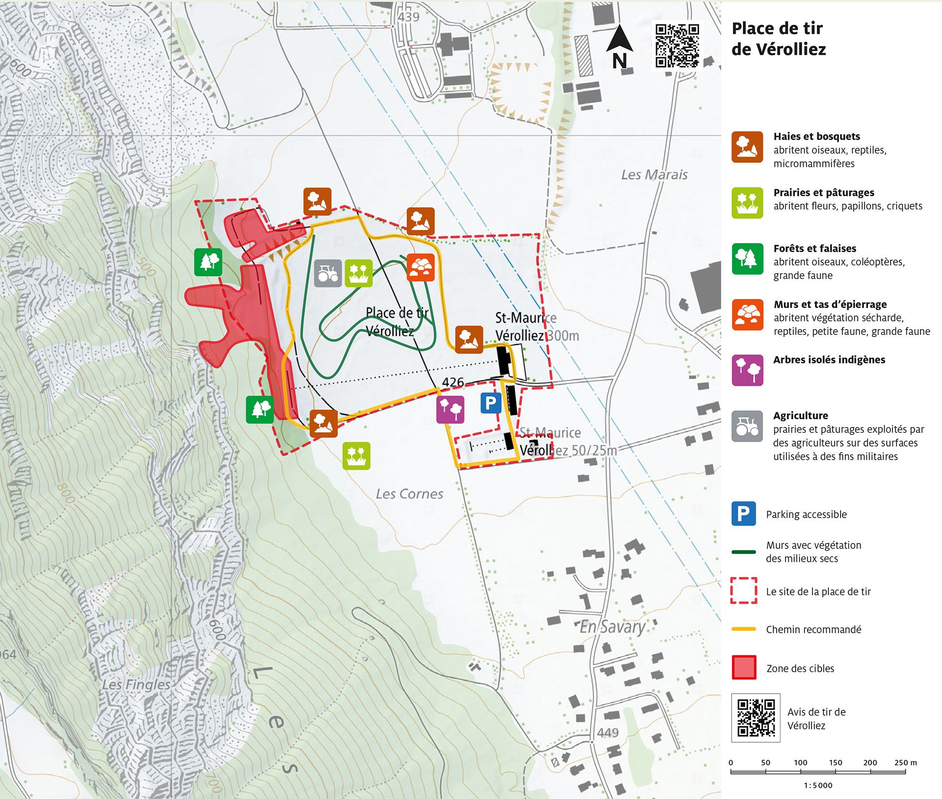 La place de tir de Vérolliez, créée en 1955, est utilisée toute l’année pour la formation continue professionnelle, les écoles de recrues, les cours de répétition, ainsi que par l'Académie de police de Savatan. Les trois quarts de la vaste place de tir de Vérolliez sont situés dans la plaine. Le dernier quart, à l’ouest du site, est situé sur un versant raide dont le bas est occupé par une hêtraie xérothermophile et quelques parois rocheuses avec suintements.