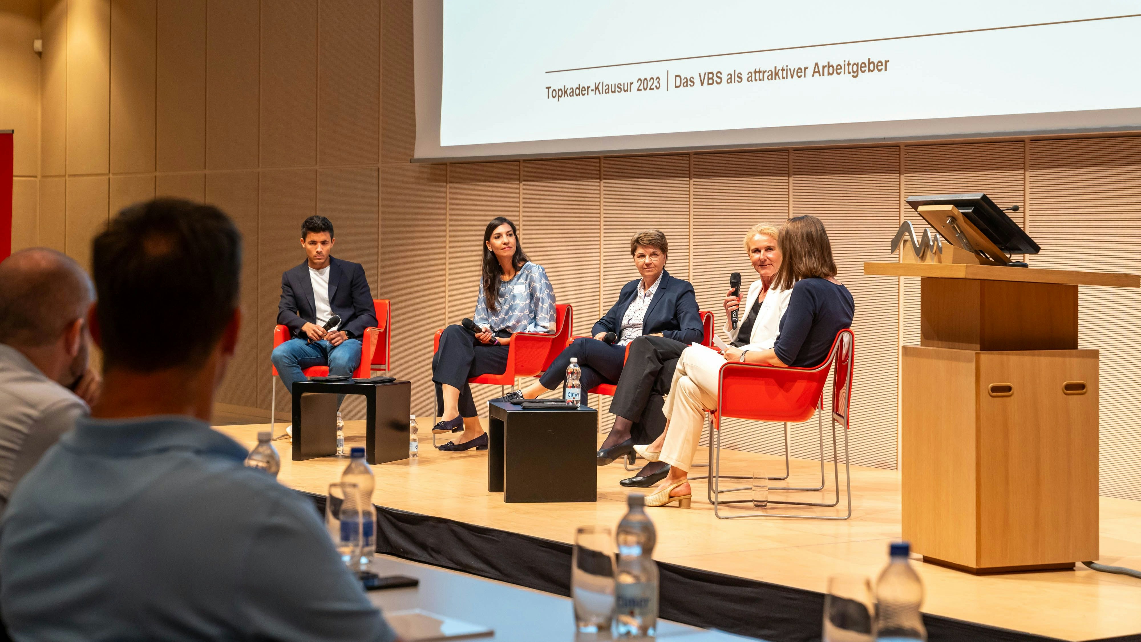 Nella successiva tavola rotonda, la consigliera federale ha discusso le sfide e le opportunità che il DDPS deve affrontare quale datore di lavoro con la prof.ssa dott.ssa Heike Bruch (direttrice dell’Istituto per la conduzione e la gestione del personale dell’Università di San Gallo), Sonia Studer (Head of Human Resources Nestle Switzerland) e Yannick Blätter (titolare della società di ricerche di mercato e consulenza Neoviso SA).