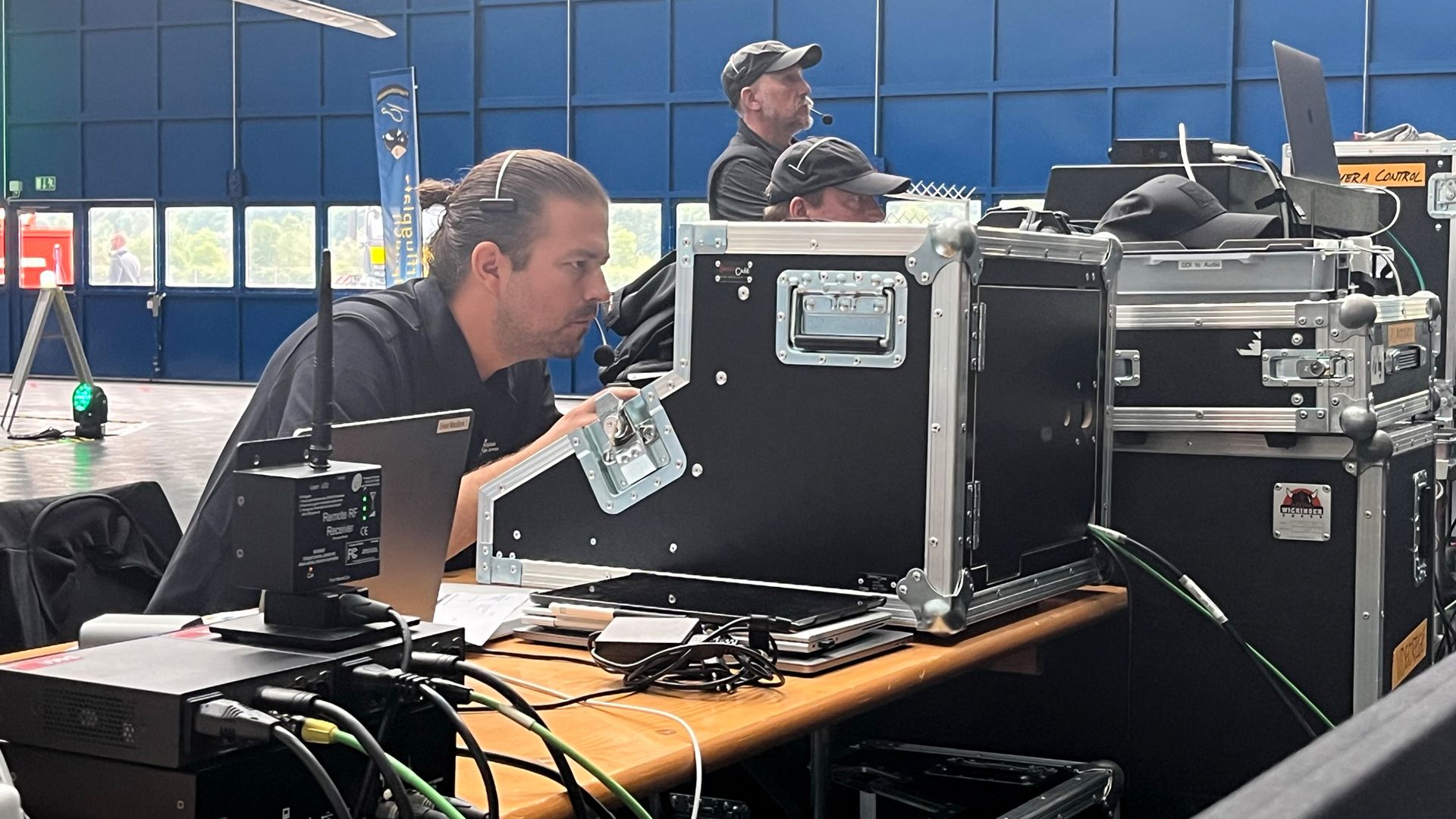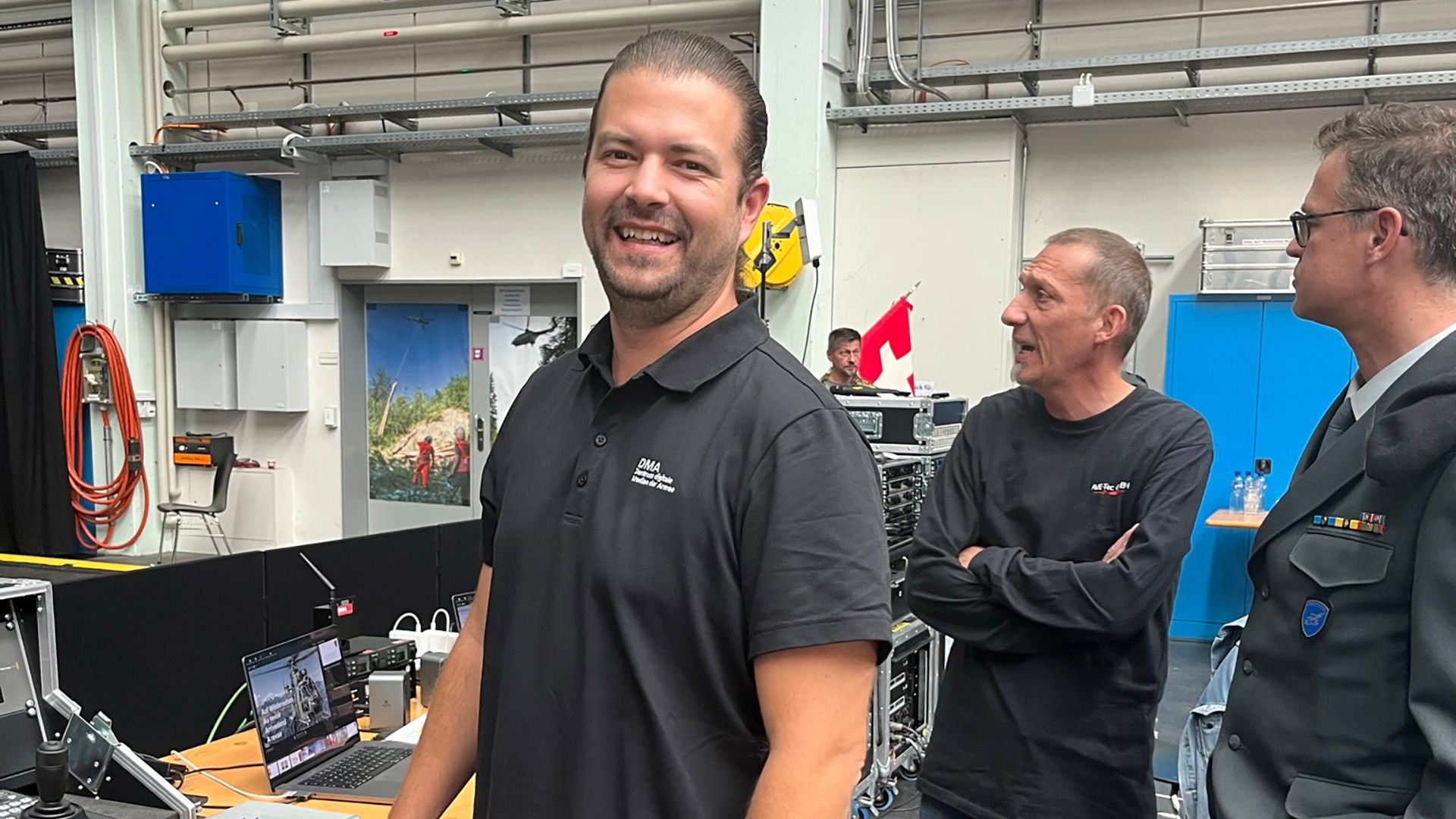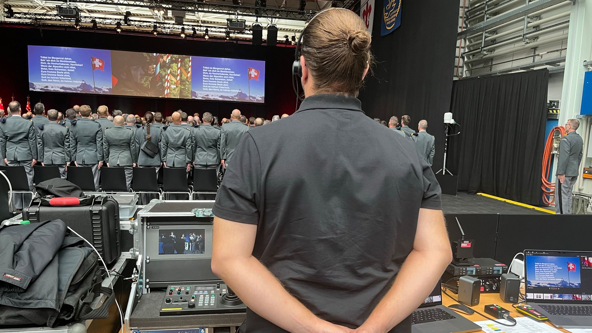 Eventi speciali o occasioni indimenticabili sono stati sicuramente la Giornata dei quadri del DDPS nel febbraio 2020, che ha dovuto essere annullata poche ore prima dell’inizio a causa del coronavirus, e poi in generale gli impieghi durante la pandemia e l’intera riprogrammazione su eventi digitali. Ho anche un ricordo speciale del mio primo incarico all’MDE: l’evento «200 anni della piazza d’armi di Thun» con un ampio sistema audio all’aperto. Nel mio posto precedente invece sono stati ad esempio lo Swiss Economic Forum a Interlaken, dove abbiamo lavorato ininterrottamente per 30 ore, e un evento del tipo più stravagante alla galleria d’arte di Basilea. (Scoppia a ridere).